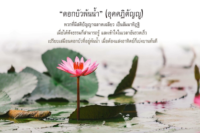 1 – พวกที่มีสติปัญญาฉลาดเฉลียว : เมื่อได้ฟังธรรมก็สามารถรู้และเข้าใจในเวลาอันรวดเร็ว เปรียบเสมือน “ดอกบัวพ้นน้ำ” เมื่อต้องแสงอาทิตย์ก็เบ่งบานทันที (อุคฆฏิตัญญู)
