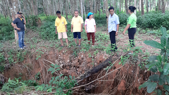 จ.นครศรีธรรมราช – พบดินทรุดตัวเป็นหลุมลึกกว่า 5 เมตร กว้าง 3 เมตร ในสวนยางพาราชาวบ้าน อ.ฉวาง ผู้ใหญ่บ้าน หมู่ 5 เผย พื้นที่นี้ไม่เคยเจอดินยุบตัวมาก่อน แต่หลังจากฝนตกหนัก เร่งประสานหน่วยงานที่เกี่ยวข้องตรวจสอบ