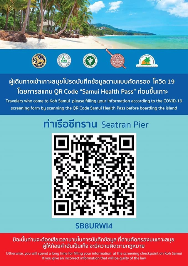 เมื่อวันที่ 15 เม.ย. 64 ศปก.อ.เกาะสมุย ออกประกาศว่าผู้ที่เดินทางเข้าเกาะสมุยทุกคน!!!จะต้องคัดกรองโควิด 19 ด้วยการสแกน QR Code “Samui Health Pass” มิฉะนั้นท่านจะต้องเสียเวลานานในการบันทึกข้อมูล ที่ด่านคัดกรองบนเกาะสมุย และเพื่อความปลอดภัยของตัวท่านและเจ้าหน้าที่
