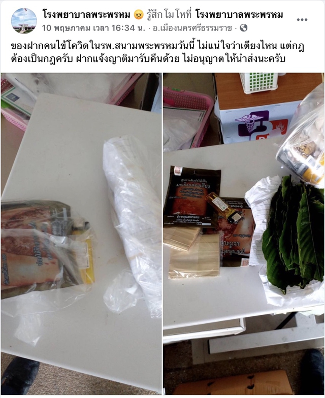 ที่รพ.พระพรหม จ.นครศรีธรรมราช ได้เผยแพร่ภาพลงในเฟสบุ๊กของ รพ.พระพรหม ถึงสิ่งของที่ญาติส่งมาเยี่ยมผู้ป่วยโควิด-19 ที่รักษาตัวอยู่ที่รพ.สนามมีทั้งใบจาก ยาเส้น และใบพืชกระท่อมสดและประกาศให้ผู้ที่เป็นเจ้าของมารับคืนไปอย่างเร่งด่วน เนื่องจากเป็นสิ่งของต้องห้ามที่ไม่สามารถฝากเยี่ยมผู้ป่วยโควิดได้ ซึ่งหลังมีการโพสต์ลงในเฟสบุ๊กได้สร้างรอยยิ้มให้กับผู้ที่พบเห็นเป็นอย่างมาก