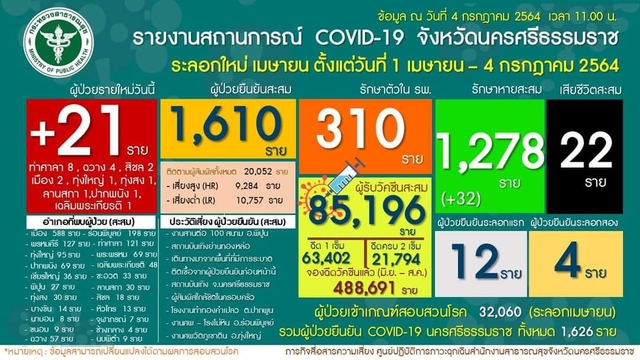 ด้านสำนักงานสาธารณสุขจังหวัดนครศรีธรรมราช รายงาน สถานการณ์โรคติดเชื้อไวรัสโคโรนา 2019 (ระลอกเมษายน) ในจังหวัดนครศรีธรรมราช วันนี้มีผู้ป่วยใหม่ 21 ราย จาก อ.ท่าศาลา 8 ราย, ฉวาง 4 ราย, เมือง 2 ราย, สิชล 2 ราย, ปากพนัง 1 ราย, ทุ่งใหญ่ 1 ราย, ลานสกา 1 ราย, เฉลิมพระเกียรติ 1 ราย และทุ่งสง 1 ราย ทำให้มีผู้ป่วยสะสม 1,610 ราย เสียชีวิตสะสมรวม 22 ราย.