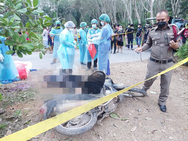 จ.นครศรีธรรมราช – หนุ่มสวนยาง ซิ่ง จยย.เข้าโค้ง ประสานงา จยย.พ่วงข้างสนั่น กระเด็นเกือบ 20 เมตร หัวฟาดท่อปูนระบาดน้ำ แผลเหวอะสยอง-ดับคาที่