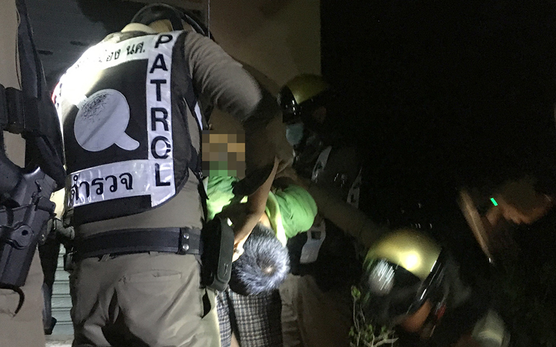 พ.ต.ท.ก่อเกียรติ ทองนุ่น รอง ผกก.ป.สภ.นศ. จึงสั่งการให้เจ้าหน้าที่ชุดสายตรวจกระจายกำลังเข้าในพื้นที่เพื่อติดตามคนร้ายที่ก่อเหตุ ใช้เวลาประมาณ 30 นาที ก็สามารถควบคุมตัว นายเอ ไว้ได้พร้อมอาวุธมีดพร้า 1 ด้าม ขณะกำลังนอนหลับอยู่หน้าบ้านที่ห่างออกไปประมาณ 100 เมตร เบื้องต้น นายเอ ยังคงให้การวกวน ปฏิเสธว่าไม่ได้ฆ่าพ่อของตนเอง แค่เพียงทะเลาะเท่านั้น