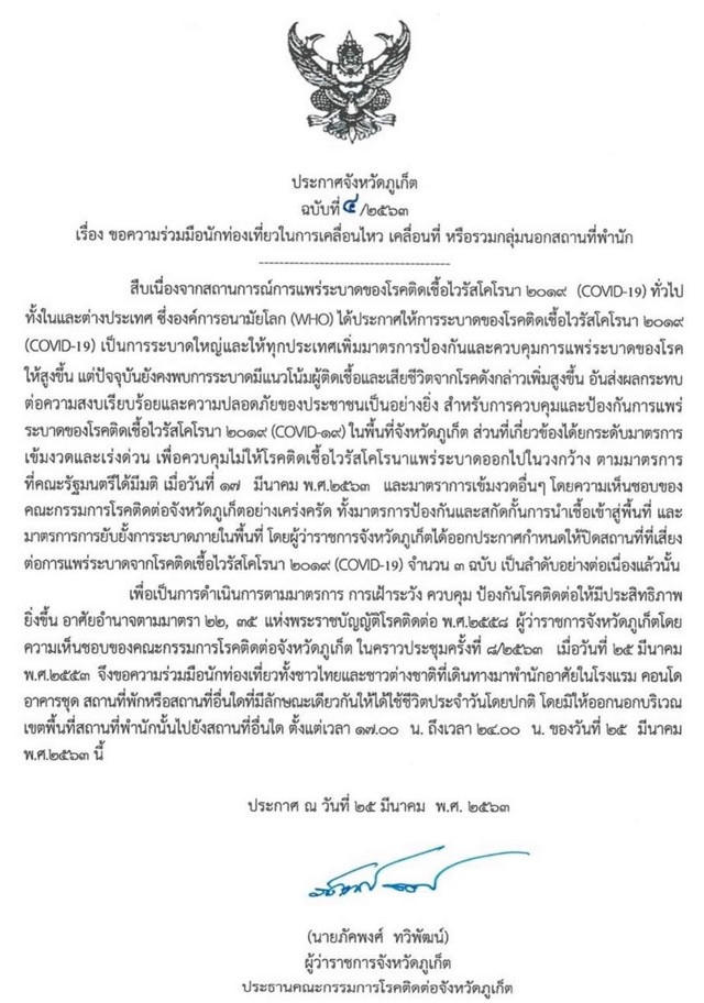 ประกาศฉบับที่ 4 ขอความร่วมมือนักท่องเที่ยวทไทยและต่างชาติที่อยู่ในจังหวัดภูเก็ต มิให้ออกนอกบริเวณที่พักของตนตั้งแต่เวลา 17.00 – 24.00 น. ของวันที่ 25 มีนาคม 2563