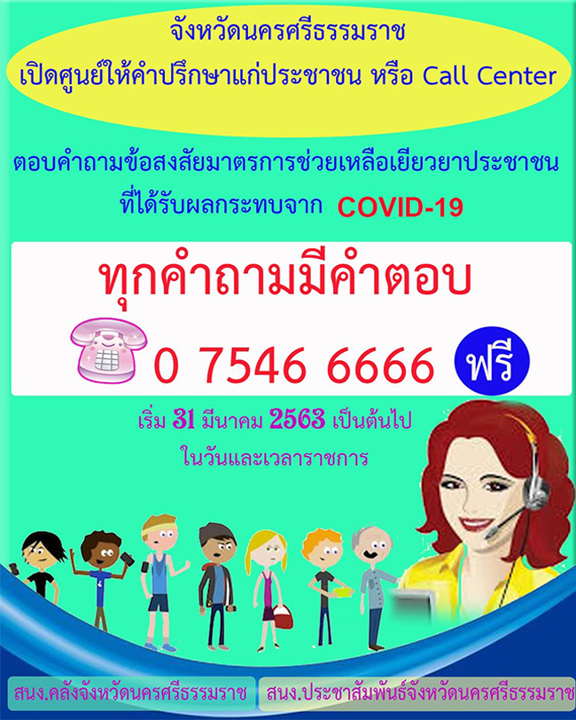 จังหวัดนครศรีธรรมราช ตั้งศูนย์ call center โทรฟรี 4 คู่สาย ตอบข้อสงสัยต่อมาตรการช่วยเหลือประชาชนที่ได้รับผลกระทบจากโรคโควิด-19