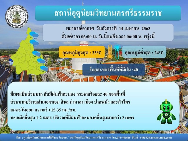 ผู้อำนวยการสถานีอุตุนิยมวิทยานครศรีธรรมราช กล่าวว่า ในส่วนของจังหวัดนครศรีธรรมราช มีฝนฟ้าคะนองกระจาย ร้อยละ 40 ของพื้นที่ ส่วนมากบริเวณอำเภอขนอม สิชล ท่าศาลา เมือง ปากพนัง และหัวไทร เป็นต้น ซึ่งฝนได้ตกลงมาตั้งแต่เช้ามืดที่ผ่านมาก ลักษณะดังกล่าวเกิดขึ้นระหว่างวันที่ 14-15 เมษายน 2563