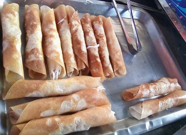 ตักไส้ใส่ตรงกลางตามยาว ใช้ตะหลิวเขี่ยแป้งม้วน ตักขึ้น ก็จะได้ขนมปำจีที่หอมหวานน่ารับประทาน